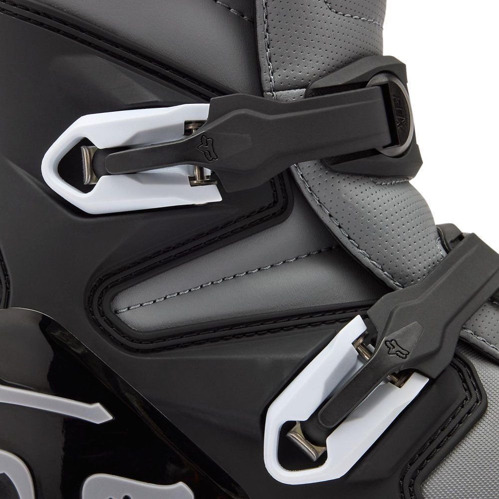 Крім того, для нових Comp Boots оновлено пряжку та систему застібки. Ця запатентована система з 4 пряжками забезпечує надійне та надійне застібка, що забезпечує точну посадку, а також має подовжені важелі для легкого відкривання та закривання. Новий механізм з кулькою та гніздом гарантує, що ваша мобільність ніколи не буде порушена завдяки цій системі, забезпечуючи «плавання», коли черевики згинаються та стискаються під час катання. Ця пряжка та система застібки однакові для всіх черевиків Fox, але Comp Boots розроблено з використанням міцних, міцних пластикових пряжок.
